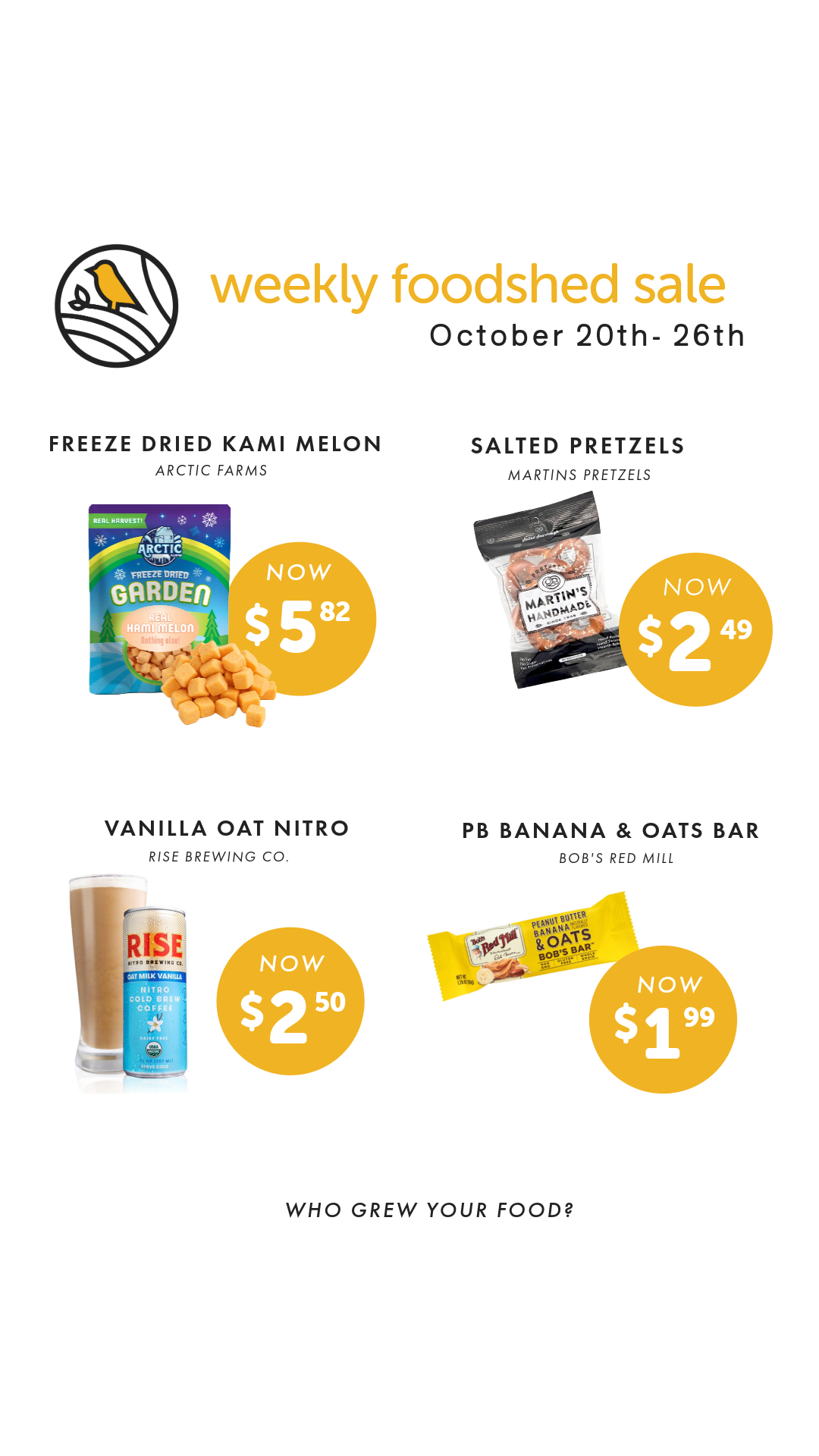 Pick up Folks: If you have questions about your pick up location or what to do if you missed pick up, PLEASE check out that info under MY ACCOUNT after logging in. You can view all info related to your goodies whereabouts from that tab. More details available at yellowbird.com/faq.